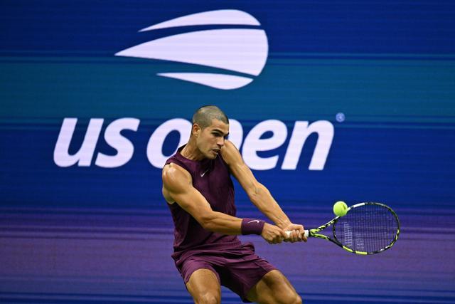 8月25日,阿尔卡拉斯在比赛中回球。新华社记者 李睿 摄